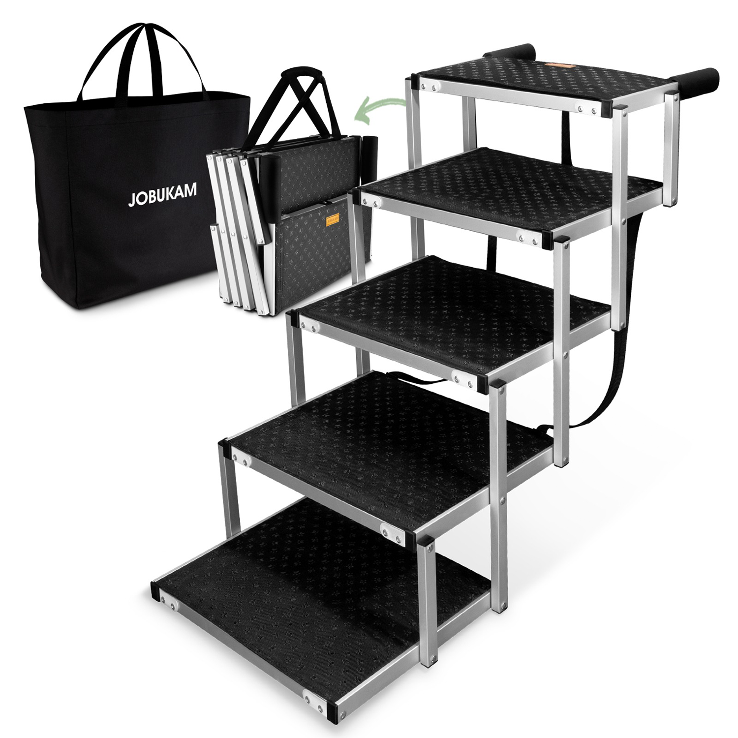 Die Hundetreppe der Marke Jobukam ist eine stufenlos einstellbare Hundetreppe. Sie soll den Ein- und Ausstieg in zum Beispiel Autos erleichtern.